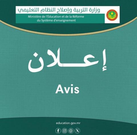 تعلن وزارة التربية وإصلاح النظام التعليمي عن تنظيم مسابقة اكتتاب محلي لـ 800 مقدم خدمة تعليم أساسي (500 معلم مزدوج و300 معلم عربية) وذلك يوم 16/10/2024 عند الساعة 8 صباحا بمباني مدرسة تكوين المعلمين بنواكشوط.